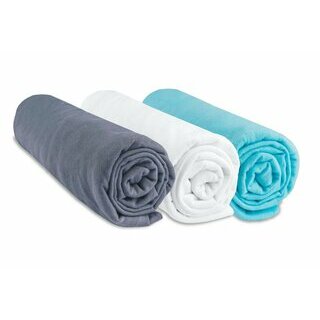 Le lot est composé de 3 draps housses en jersey coton : un gris, un blanc, un turquoise.